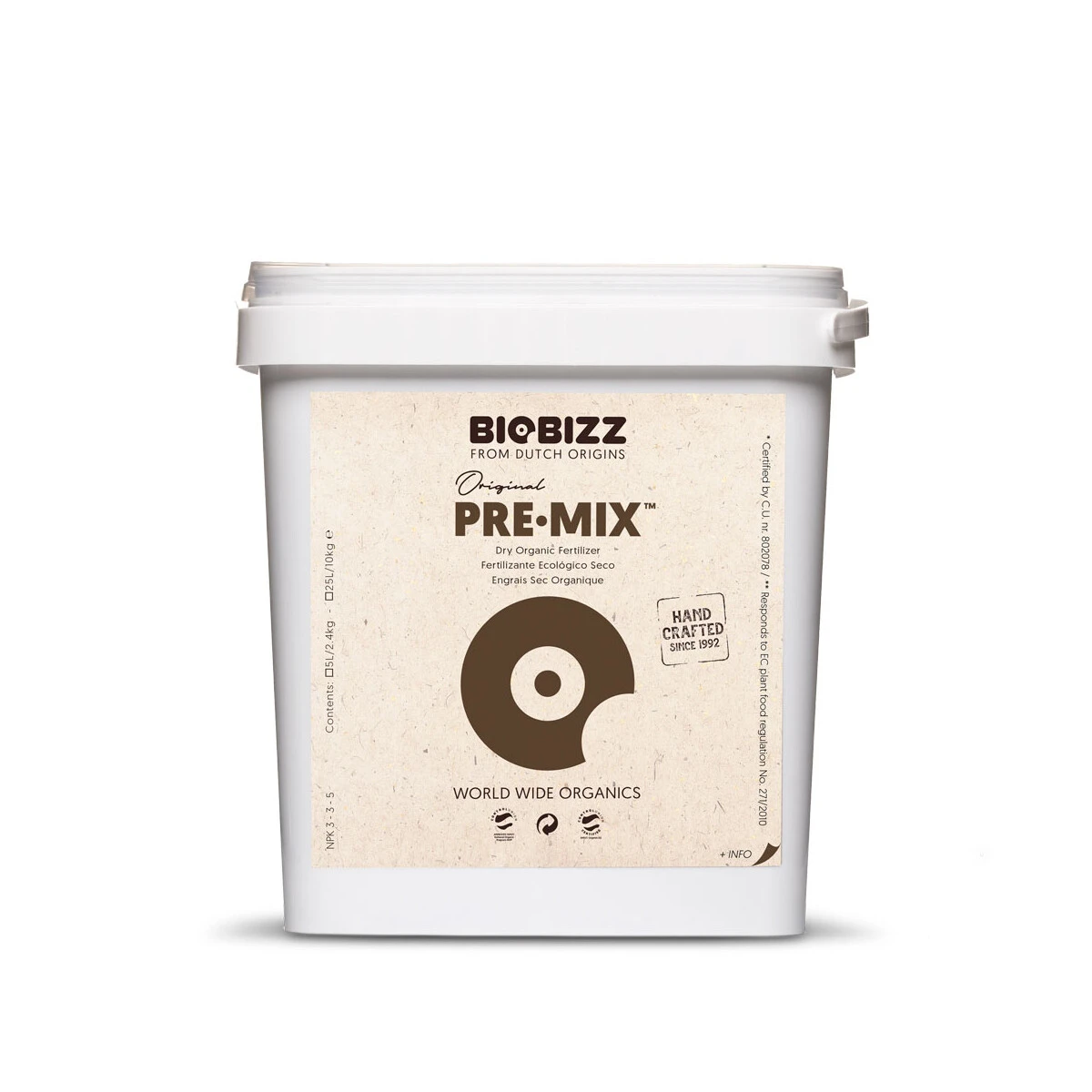BioBizz Pre-Mix ist eine Mischung unterschiedlicher biologischer Inhaltsstoffe. Er ist als Nahrung beim Umtopfen von Pflanzen oder als Startnahrung entwickelt worden. Neben den verschiedenen organischen Düngerbestandteilen sind zusätzlich Steinmehl, Spurenelemente und gutartige Pilze untergemengt.