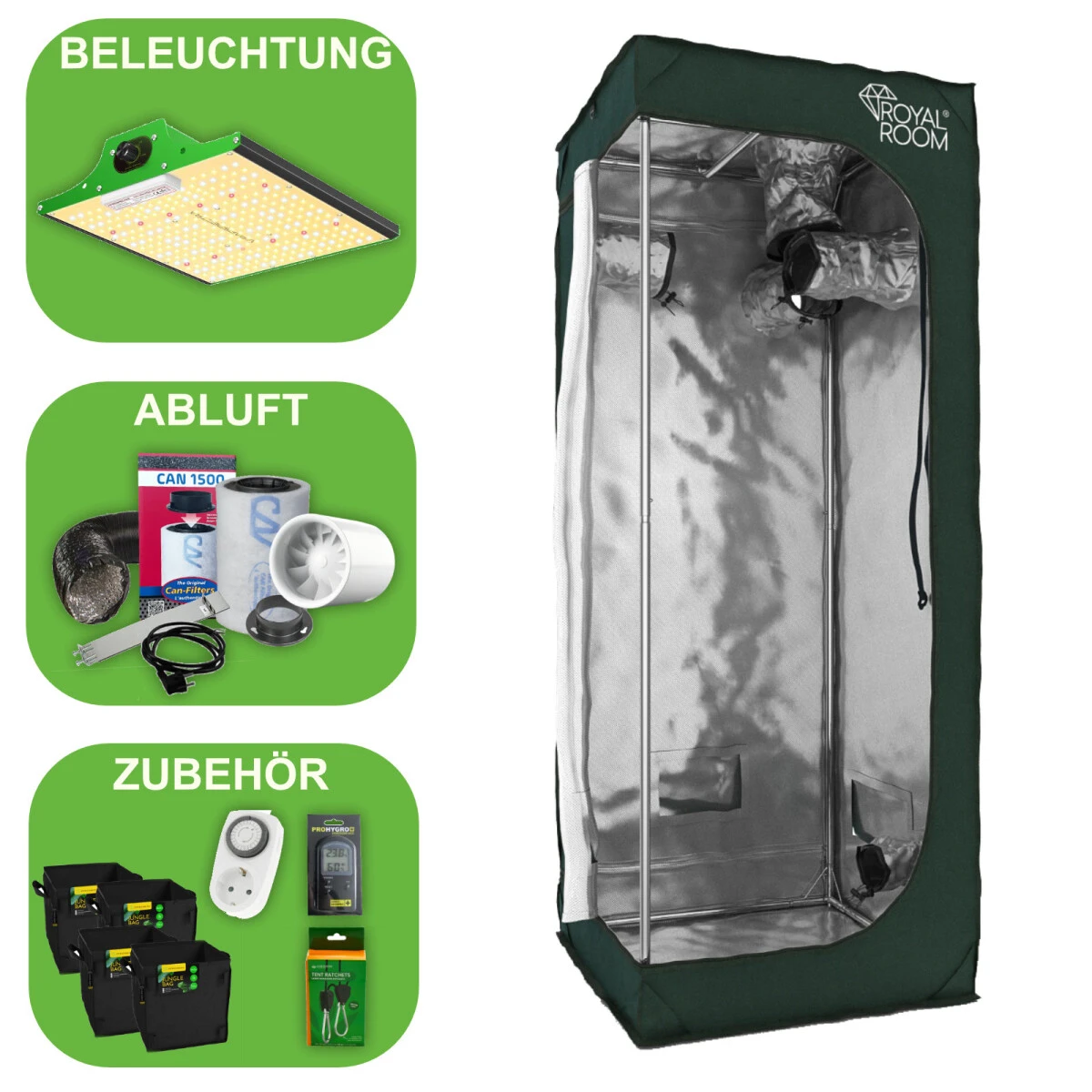 Außerdem findest du in unserem GrowBox Komplettset Low Budget C60 mit LED noch eine Zeitschaltuhr für die Steuerung der LED, ein paar Easy Grow Heavy Hanger zur Aufhängung der LED oder des Filters (können optional eingesetzt werden), ein Hygro-Meter zum kontrollieren der Temperatur und Luftfeuchtigkeit, sowie 4 Herbgarden Stofftöpfe mit 11 Litern Fassungsvermögen.
