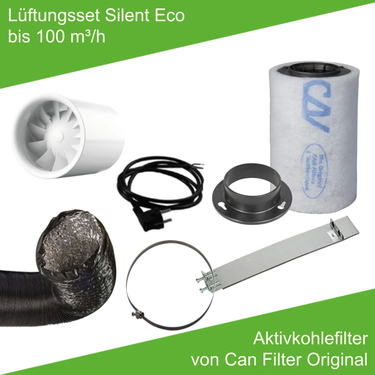 - Lüftungsset mit Silent 100 Axialventilator, Can Original Filter PL1500 mit 100 mm Flansch, 1 Meter Schlauch, Netzstecker (Montage erforderlich)