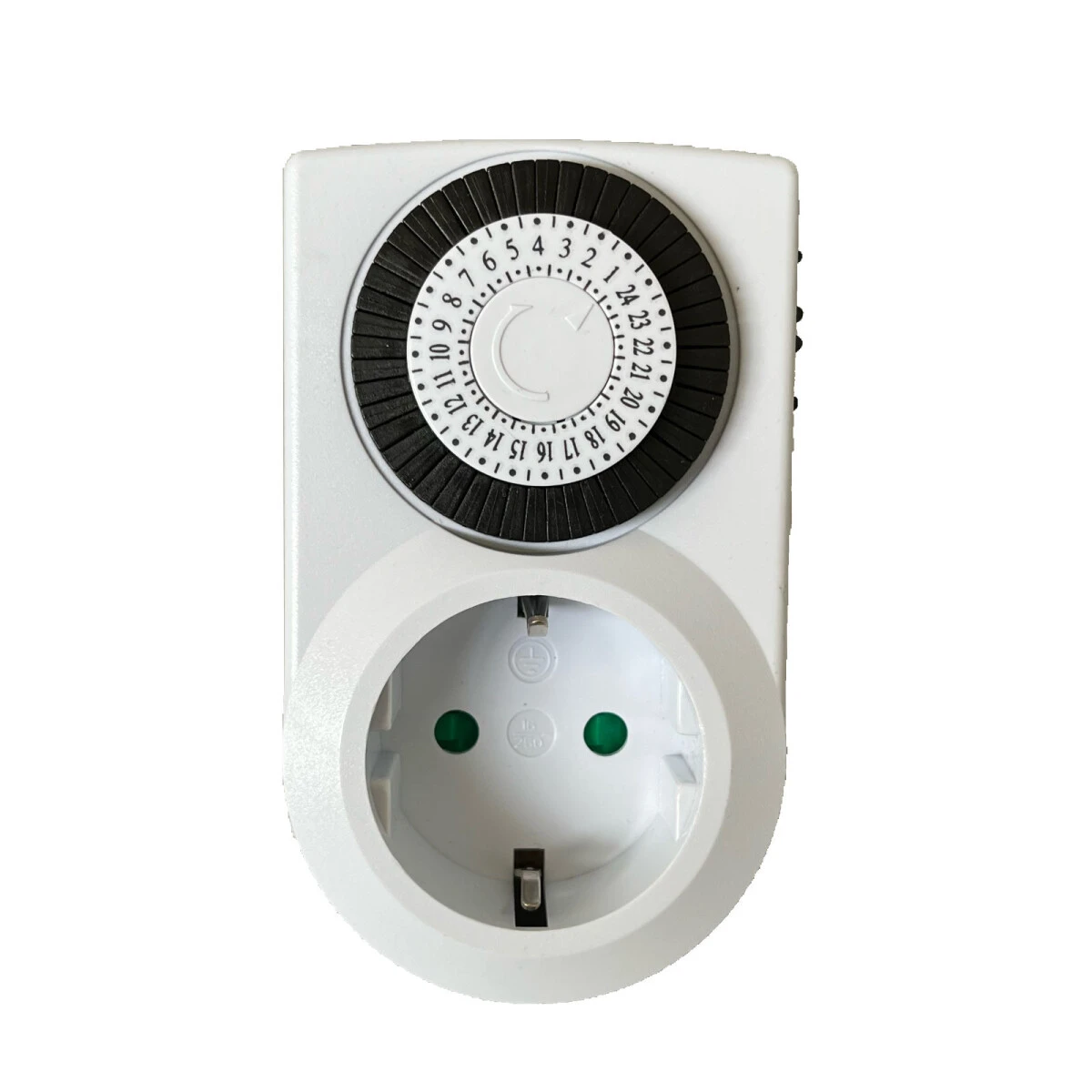 Mit der OmniRex T Zeitschaltuhr ist eine zuverlässige, analog einstellbare Helferin mit an Board, die sich schon bei HPS-Lampen bewährt hat. Sie zeichnet sich durch ihre besondere Robustheit aus, da sie hohe Startströme, die beim Einschalten von HPS-Lampen, aber auch bei LED-Leuchten auftreten können, besser verkraftet. Auch die Bedienung ist sehr simpel. Über einen Schiebeschalter lassen sich Dauerbetrieb und Zeitschaltbetrieb auswählen. Die tatsächlichen Schaltzeiten lassen sich über kleine Kippschalter im 15-Minutentakt auswählen und die Zeit wird mit einem Drehschalter eingestellt.