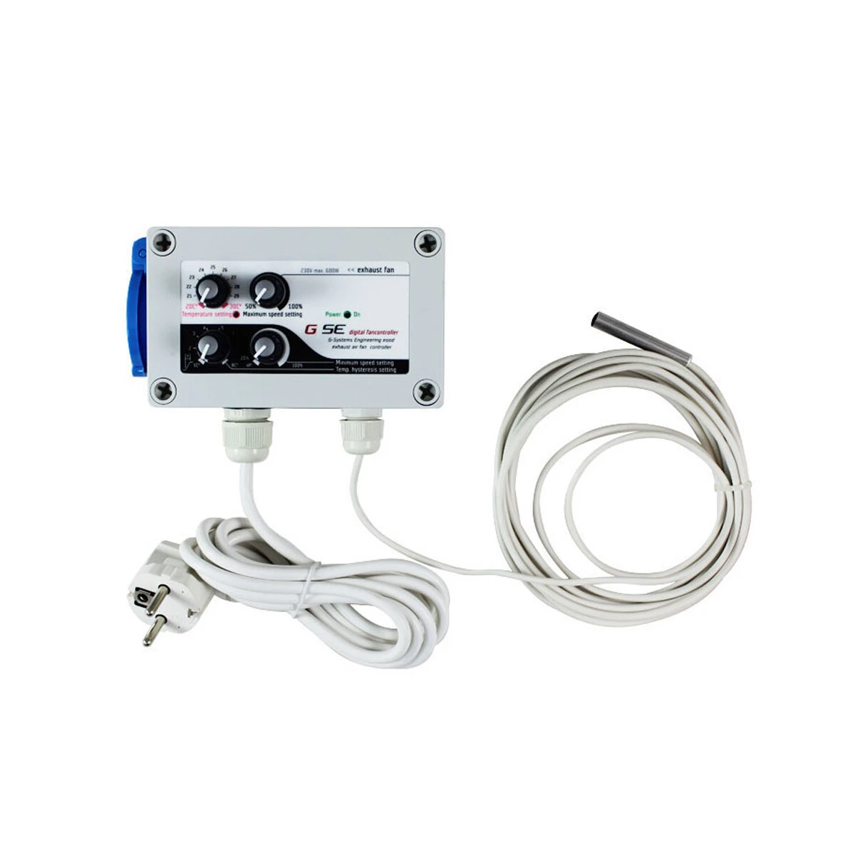 Mit dem GSE Klima-Regler mit Hysteresefunktion lassen sich ein einzelner oder gleich mehrere Ventilatoren eines Raumes parallel steuern. Der Controller besitzt einen Sensor mit einem vier Meter langem Kabel. Er ist für die Schutzklasse IP54 zertifiziert und eignet sich somit auch perfekt für feuchte Räume. Um den Controller vor Überhitzung zu schützen sind 2 interne Temperatursensoren verbaut. Ein Sensor ist am Prozessor verbaut und ein Sensor schützt das Gerät am Kühlkörper. Klappdeckel an der Steckdose und eine versiegelte, wasserdichte Abdeckung runden das Bild ab.