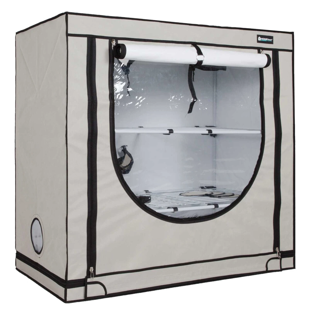 Man kann also frei wählen, ob man die Nutzfläche mit bis zu 12 großen Propagatoren bestückt oder ob man Pflanzen im Wachstum den „Luxus“ von mehr Freiraum gönnt. Zusätzlich stehen vier einzelne Regaleinleger zur Verfügung, die variabel eingesetzt werden können. Daher besteht die Möglichkeit auf der einen Zeltseite ein großzügiges Pflanzzelt zu schaffen und den anderen Bereich für kleinere Pflanzen zu nutzen – unschlagbar flexibel!