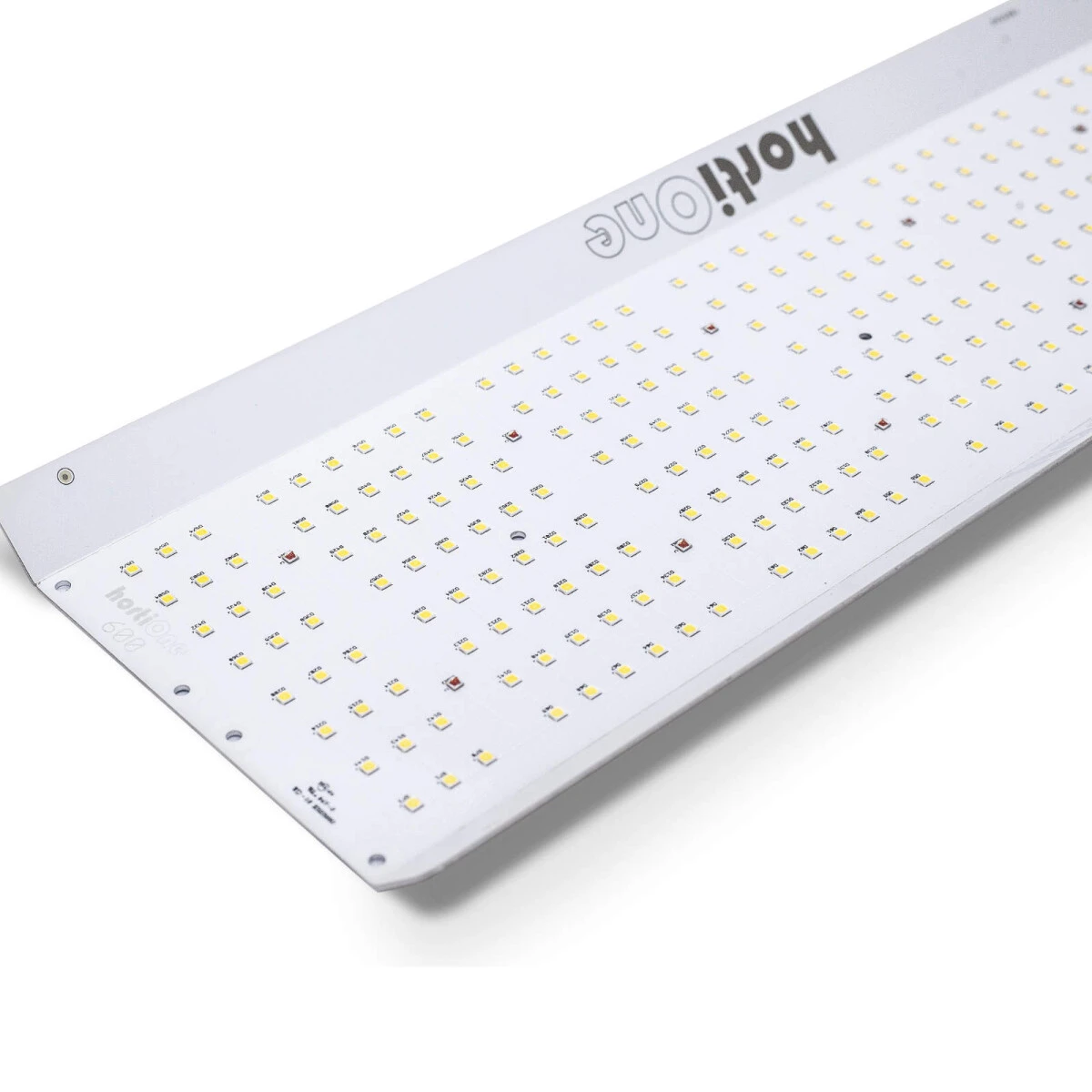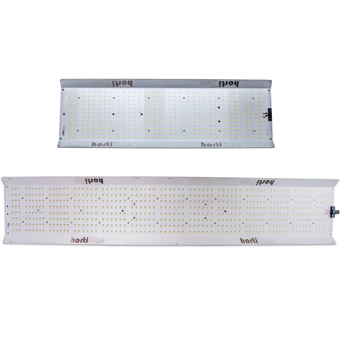 Auch die dritte Version der hortiONE ist wieder in zwei Modelle unterteilt. Die kleine, 51cm lange hortiONE 420, wird mit maximal 150 Watt angesteuert und hat dem Namen nach auch 420 LEDs. Die größere, 94 cm lange hortiONE 600, arbeitet mit 600 Chips und 220 Watt maximaler Leistungsaufnahme. Beide LEDs decken den größten Teil des Lichtspektrums mit den Seoul 3030C-Chips ab, doch für den erhöhten Rotanteil im Licht sind Osrams Hyper-Red-Dioden verbaut worden.