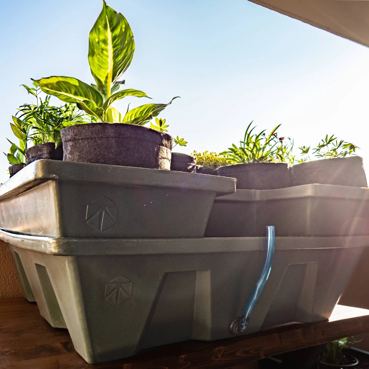 Das System besteht aus einem 100 Liter Tank. Auf diesem Vorratsbehälter für die Nährlösung sitzt der Fluttisch. Dieser Tisch ist über Rohre und eine Pumpe mit dem Tank verbunden und wird mit Hilfe der Pumpe regelmäßig geflutet. Bei korrektem Aufbau und aufgrund des durchdachten Designs kann ein Überlaufen des Systems ausgeschlossen werden. Die Zeiten, die die Pumpe arbeiten soll, können mit einer einfachen Zeitschaltuhr eingestellt werden (Zeitschaltuhr ist nicht im Lieferumfang enthalten).