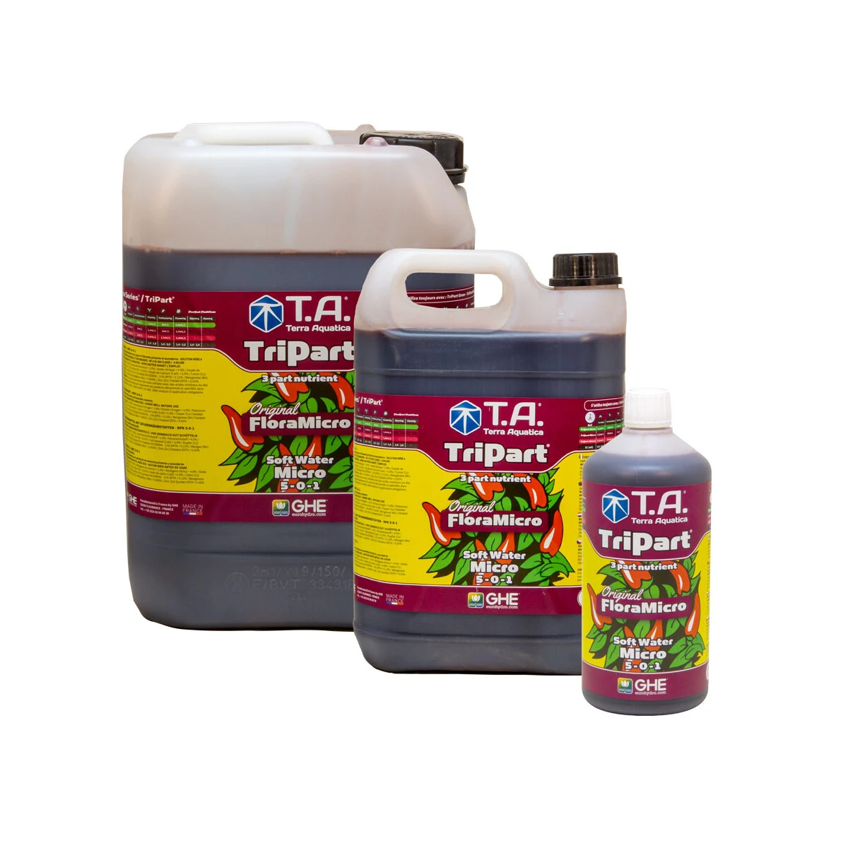 TriPart Micro Soft Water ist ein hochwirksames Spurenelement-Supplement und ein Hauptbestandteil im TriPart Düngesystem von Terra Aquatica. Das System besteht aus drei Komponenten, die alle über den gesamten Lebenszyklus der Pflanze zum Einsatz kommen. TriPart Micro ist dabei das einzige variable Produkt und in einer Version für hartes (HW) und einer Version für weiches Wasser (SW) erhältlich. Allein das Mischungsverhältnis der drei Komponenten zueinander bestimmt, welchen Nähstoffgehalt die Nährlösung am Ende hat.
